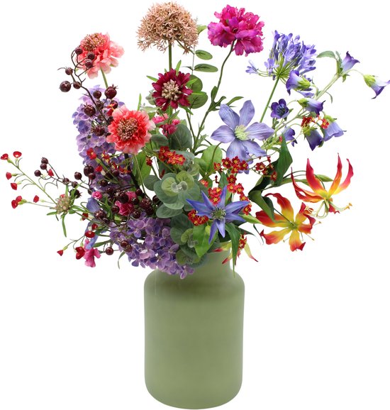 Flower Junkie - Fleurs Fleurs artificielles - Bouquet de Fleurs en soie - Bouquet champêtre - 60 cm de haut - 6 tiges - Cueillies en été - Scabiosa - Clématite - Cosmea - Printemps - Printemps - Fausses fleurs