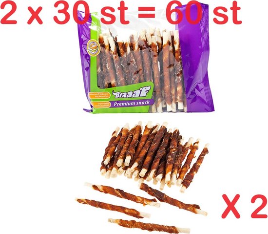 2 X BRAAAF : snack pour chien - bâtonnets roulés au canard - sans gluten - qualité premium - 12,5 cm - 30 pcs