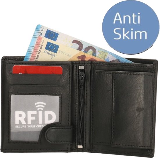 Porte Double-D / Porte-cartes de crédit - Compartiment monnaie et billets - Anti Skim - 8 cartes - 100% Cuir - Zwart