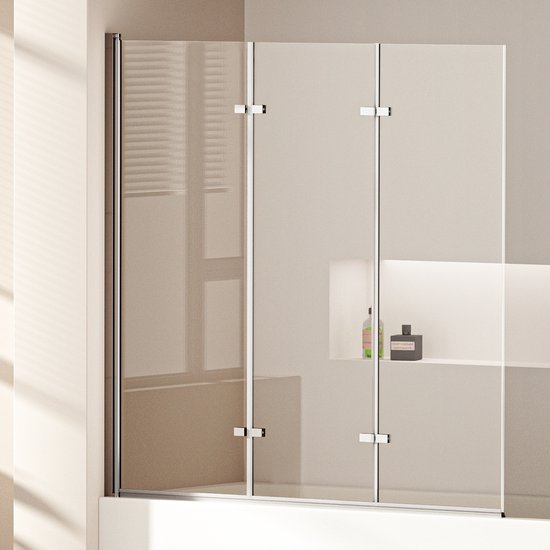 EMKE Paroi de Baignoire - Paroi de Baignoire Pliante en 3 Parties - 130x140 cm - Chrome - Verre de Sécurité Transparent 6 mm - Revêtement Nano - Profilé en Aluminium - Pare-baignoire