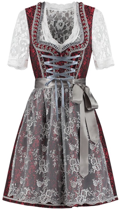 Dirndl Deluxe Oktoberfest - Rouge-Gris-Argent, Tablier en Dentelle - Taille 44