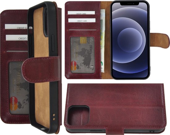 Coque Iphone 12 - Bookcase - Coque Iphone 12 Portefeuille Portefeuille En Cuir Véritable Couverture Rouge Bordeaux