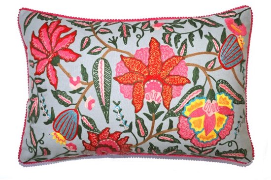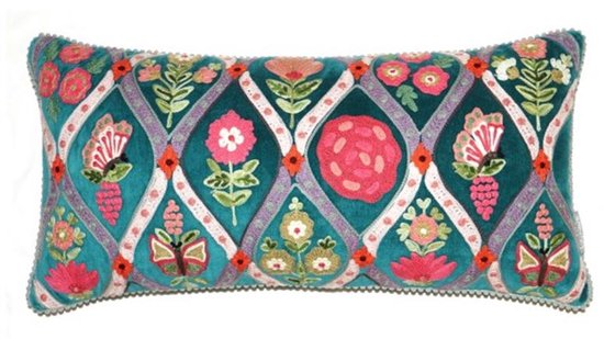 Sierkussen 30x60 cm gris-bleu avec fleurs brodées roses, violettes, orange