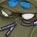 La première et la seule combinaison pilote avec un masque de sommeil avec des lunettes de soleil métalliques cool. Et un oreiller cervical gonflable super pratique dans la capuche pour plus de confort lors de vos voyages ou de vos devoirs. Points forts: * Disponible en 2 couleurs, allover marine et vert armée * 100% coton * Oreiller cervical gonflable amovible * Masque de sommeil pratique dans la capuche * Poches à l'avant * Jolis détails "aviation". Taille 98/104.
