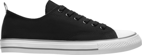 Chaussure en toile classique avec semelle en caoutchouc blanc, finie avec des lignes de couleur. Œillets d'aération sur le côté, embout et laçage en caoutchouc