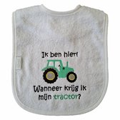 Bavoir Witte avec "Je suis là ! Quand vais-je recevoir mon tracteur ?" - doux, cadeau de maternité, cadeau, baby shower, vert