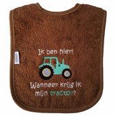 Bavoir marron avec "Je suis là ! Quand vais-je recevoir mon tracteur ?" - tracteur vert - mignon, cadeau de maternité, cadeau, baby shower, vert, agriculteur, agriculteurs, outil