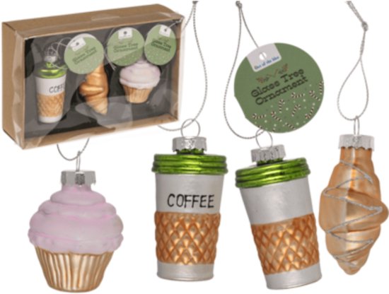 Décorationsde Noël en Verre – Série de 3 – Café, Croissant & Cupcake – Design Original – Verre de Haute Qualité – Cordons d'Accrochage Inclus – Format Compact – Parfait pour Sapin de Noël ou Cadeau