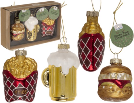 Ensemble de boules de Noël en verre fastfood de 3 – Burger, Frites & Verre de bière – Décoration de Noël originale – Cordons de suspension dorés luxe – Format compact – Parfait comme cadeau pour les amateurs de fastfood