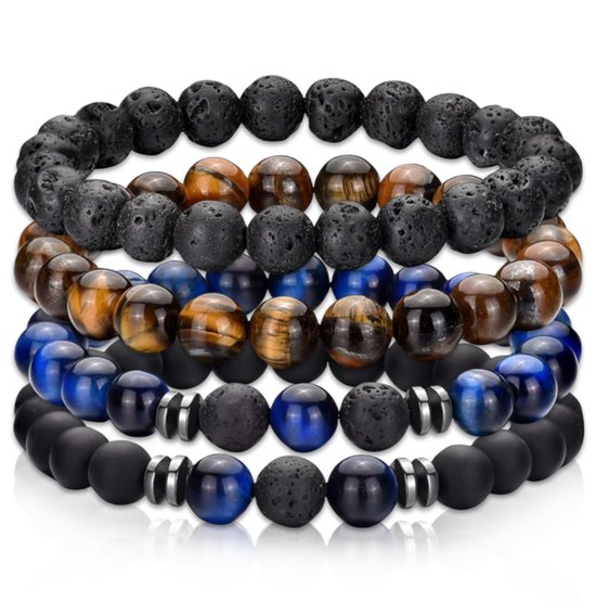 Bracelets en Natuursteen de Nalussa - Bracelets en Perles lot de 4 - Bracelet Multi Natuursteen - Zwart, Marron, Blauw, Zwart/ bleu - Bracelet Homme - Bijoux - Cadeau