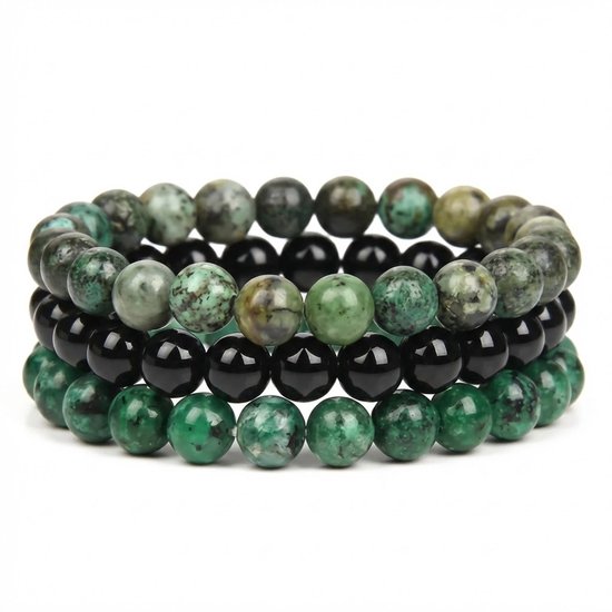 Ensemble de bracelets en perles vertes et noires pour femmes et hommes - Bracelet élastique en pierre - 3 pièces