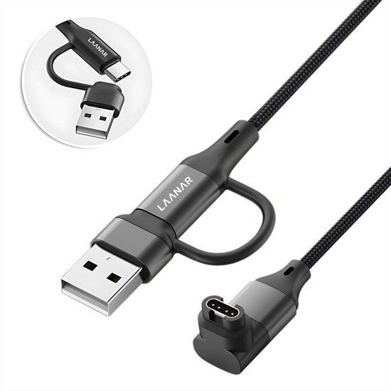 Câble de charge LAANAR® pour montre Garmin Instinct / Forerunner / Vivoactive / Venu / Fenix / Enduro / Tactix / Quatix / Approach / Vivosmart / Vivosport / Swim / D2 - Nylon tressé 1 mètre - Aluminium Zwart