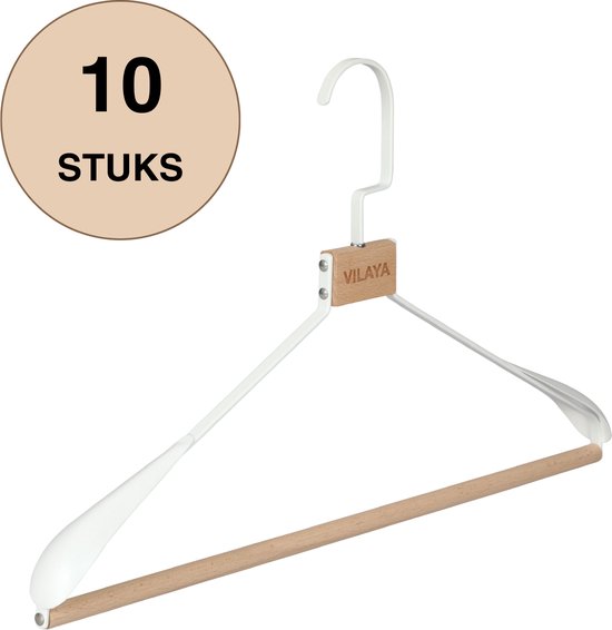 Cintres VILAYA - 10 pièces - Wit - Métal et bois - Antidérapants - Premium et durables - Solides - Crochet pivotant - Cintres - Cintres pour pantalons - Cintres pour vêtements