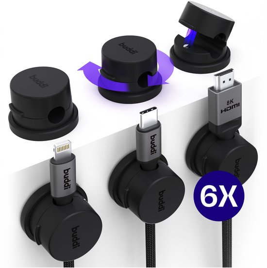 Buddi Sorted Magnetische Kabelclip (6-Pack) - Organizer voor Bureau, Nachtkastje, Tafel & TV-meubel - Zelfklevende Kabelhouders - Magnetisch Kabelmanagement - Kabelklemmen Zwart
