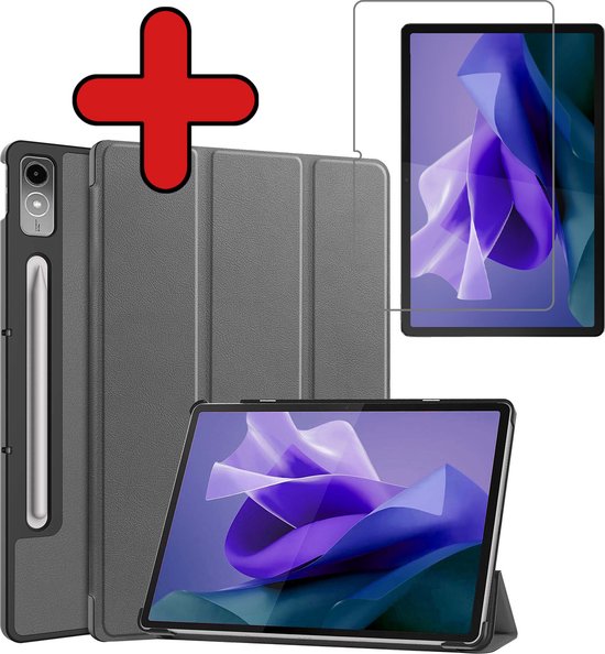 Étui pour Lenovo Tab P12 Cover Book Case Étui de Luxe à trois volets avec découpe adapté pour S Pen avec protecteur d'écran - Étui pour Lenovo Tab P12 Cover Bookcase - Grijs