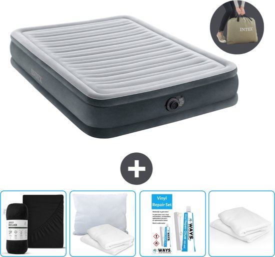 Intex Airbed - Lit double - 137 x 191 x 33 cm - Grijs - Pompe incluse - Hoeslaken - Oreiller - Kit de réparation et protège-oreiller