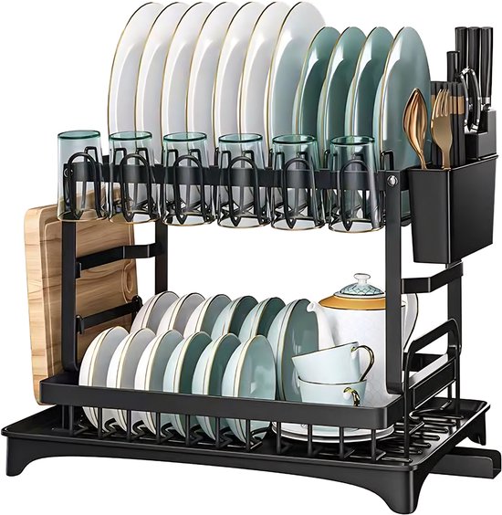 Égouttoir à vaisselle Somstyle avec bac de récupération - 42 x 29 x 29 cm - Égouttoir à vaisselle - Égouttoir à vaisselle à 2 niveaux - Zwart