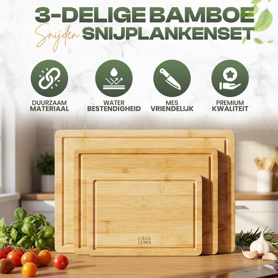 CASA LUMA Ensemble de Planches à Découper en Bambou 3 Pièces - Bambou Biologique Premium - Avec Gouttière à Jus - Durable - Planche à Tapas - Planche à Servir - Planche à Découper en Bois