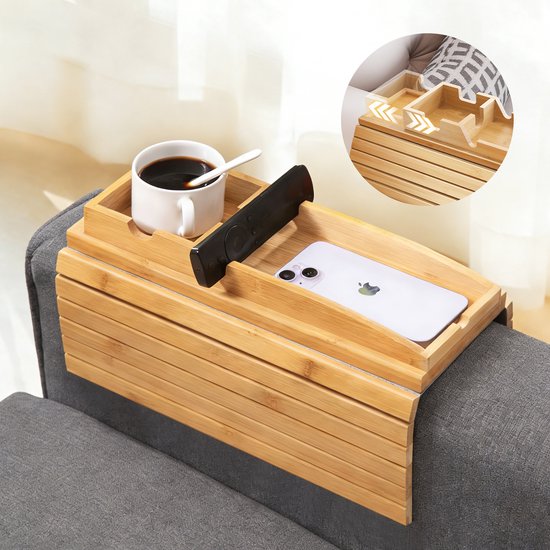 Plateau d'accoudoir Tuko - Bamboe - Marron - Flexible - Antidérapant - Support de téléphone - Organisateur - Banc - Siège