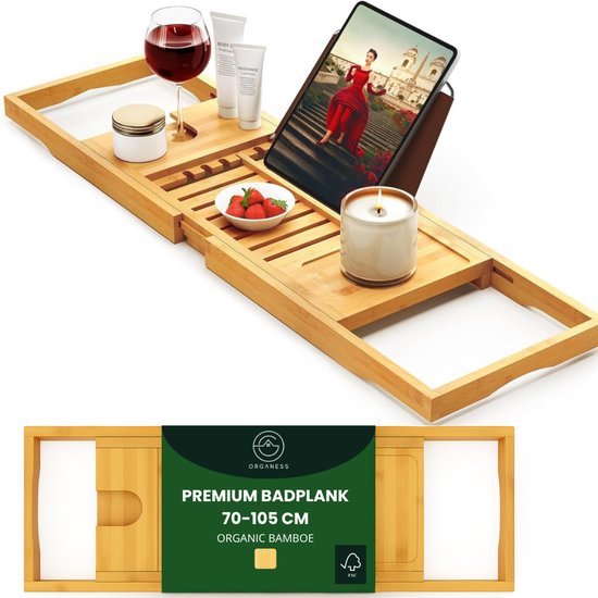 Planche de bain - Support de bain - Extensible - 50-85 centimètres - 100% Eco Bamboe - Espace pour tablette, téléphone, Boek, Glas, bougie