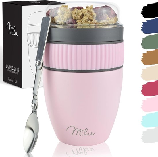 Tasse de muesli Milu à Go | Pot de yaourt à Go 400 ml | Pot à yaourt isotherme en acier inoxydable pour muesli | Gobelet à muesli anti-fuite avec cuillère pour yaourt/porridge (rose)