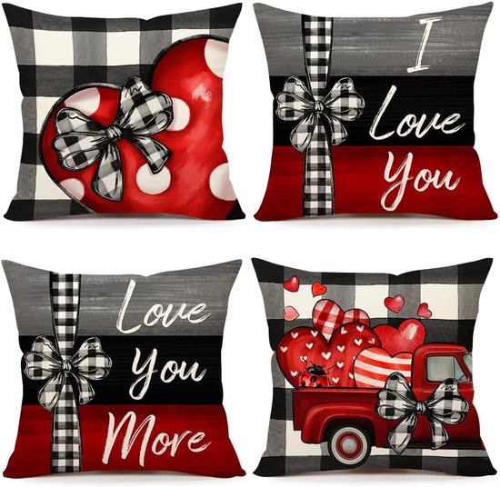 Ensemble de taies de kussen Saint-Valentin (4 pièces, 45 x 45 cm), motif à carreaux de buffle, printemps, style ferme, festif, rouge-gris, adapté à la décoration de canapé à la maison.