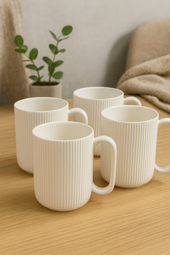 Tasses en céramique côtelée – Lot de 4 – 300 ml – Anse ovale moderne – Tasses à Café et à Thee élégantes