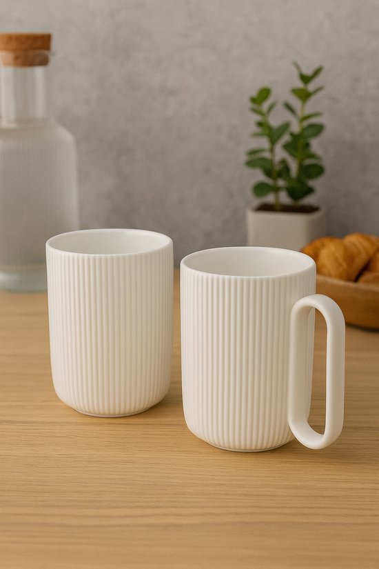 Mugs en céramique côtelée – Lot de 2 – 300 ml – Anse ovale moderne – Tasses à Café et à Thee élégantes