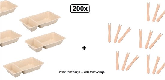 200x Bac à frites Bio A7 avec compartiment à sauce + 100x Fourchette à collation en bois - Frites frites chips sauce frites plateau snack nouvelle génération carnaval fête à thème