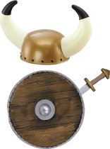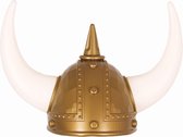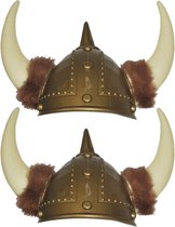 2x vikings habillés avec un casque à cornes. Casque Viking de couleur or pour femmes et hommes. Fait de plastique. Chapeaux de carnaval pour déguisements.
