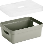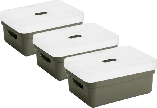 3x boîtes de rangement/paniers de rangement pour la maison de couleur verte de 9 litres en plastique avec couvercle transparent. En raison du design moderne et de l'aspect luxueux des boîtes, vous pouvez placer ces boîtes de rangement / boîtes de rangement dans le salon ou la chambre. Ce panier/poubelle convient, par exemple, pour ranger des speelgoed, des livres, de la nourriture, des bric-à-brac qui traînent. Idéal également pour la salle de bain ou dans le garde-manger. Le panier a des poignées pour un transport facile. Taille : environ 35 x 25 x 12 cm. composé de 3x boîtes de rangement/paniers de rangement vert foncé 9 litres en plastique, 3x couvercle transparent pour boîte de rangement Sunware de 9/13/18/25 litres série Sigma