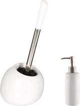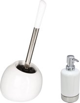 Five WC / brosse de toilette avec support, blanc avec distributeur de savon 300 ml. Fait de poterie. La partie supérieure du manche de la brosse WC est en métal et forme le couvercle de la cuvette. Taille : environ D12 x H39 cm. Taille du distributeur de savon : environ 7 x 17 cm.