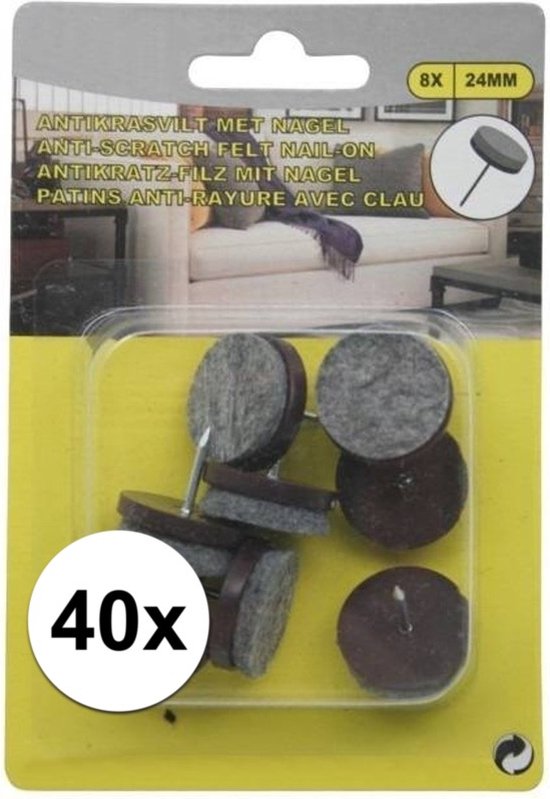 5x Meubles anti-rayures en feutre marron 8 pièces avec clou. Empêche les dommages aux sols et autres surfaces molles. Très bonne tenue par l'ongle. Taille: 2,4 x 0,8 x 2,4 cm. Diamètre: 2 cm. Matière : plastique. Vous recevrez 5 packs de 8 pièces.