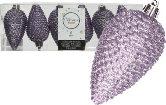 6x morceaux de pommes de pin à paillettes en plastique pendentifs de Noël bruyère lilas 8 cm. Set de boules de Noël incassables en forme de pommes de pin. Les pommes de pin sont parsemées de paillettes. Nous vous conseillons de commander nos crochets pour boules de Noël (non inclus). Matériau : plastique. Diamètre de la taille : 4,5 cm. Hauteur : 8cm. Décorations Décorations pour sapins de Noël/décorations de Noël et ornements de Noël.