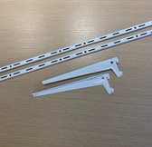 6x supports d'étagères / supports d'étagères blancs pour système de rail / rail mural. Ces supports d'étagères sont en acier et ont une laque blanche. Les supports d'étagère conviennent à une étagère d'une largeur de 25 cm, vous déterminez vous-même la longueur de l'étagère. La capacité de charge maximale est de 110 kg pour deux supports d'étagère. Conseil : installez des supports d'étagère tous les 50 cm pour maintenir la capacité portante de 110 kg. Capacité de charge pour 2 porteurs : 110 kg. Longueur : 25 cm. Couleur : blanc. Matériel: acier.