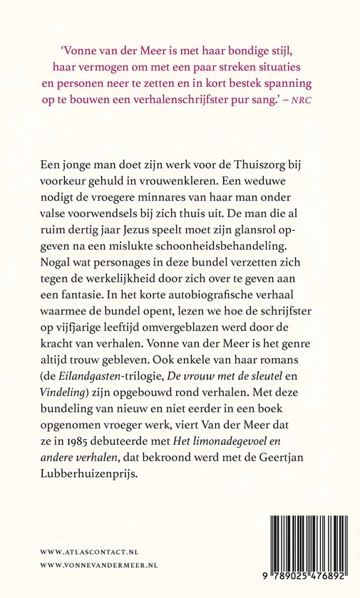 In het korte autobiografische titelverhaal lezen we hoe de schrijfster op vijfjarige leeftijd omvergeblazen werd door de kracht van verhalen. Vonne van der Meer is het genre altijd trouw gebleven. Ook enkele van haar romans (de Eilandgasten-trilogie, De vrouw met de sleutel en Vindeling) zijn opgebouwd rond verhalen. Met deze bundeling van nieuw en niet eerder in een boek opgenomen vroeger werk, viert Vonne van der Meer dat ze in 1985 debuteerde met Het limonadegevoel en andere verhalen dat bekroond werd met de Geertjan Lubberhuizenprijs.
