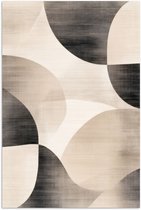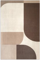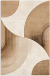Jeu de segments circulaires et de motifs superposés en beige et marron. Les formes sont fluides mais épurées, avec un look rétro...