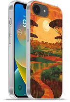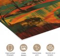 Un soleil chaud se couche sur un vaste paysage avec des arbres africains typiques. Le ciel et la terre sont peints dans des tons orange avec des accents verts dans la végétation.