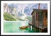 Bateau en bois sur un lac de montagne alpin. Lago di Braies, Alpes Dolomites, Italie. Bateau en bois sur le lac d'Alpenberg