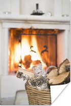Posters - Cheminée derrière un panier de bois - Affiche photo