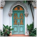 Une double porte turquoise et or avec des motifs complexes et une arche gothique. Le cadre blanc et doré et les plantes vertes luxuriantes accentuent l'architecture raffinée.
