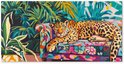Un léopard détendu allongé sur un canapé coloré à motifs floraux dans un décor tropical. Les feuilles lumineuses et les textures riches rendent la scène ludique et exotique.