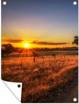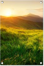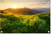 Faites corps avec la nature avec ce poster de jardin. L'affiche a une image d'un paysage herbeux avec un coucher de soleil brillant sur les montagnes.