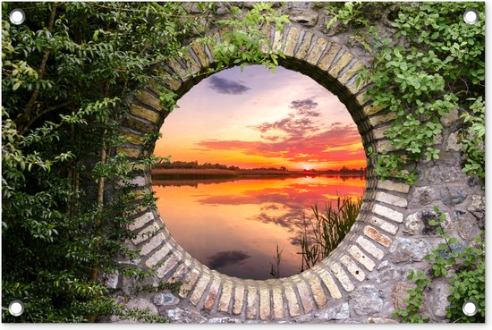 Affiche de jardin - Lac - Vue à travers - Soleil - Water - Toile de clôture - 60x40 cm - Peinture de jardin - Toile de jardin