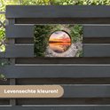 Cette affiche de jardin est unique en raison de la vue sur le coucher de soleil qui brille juste au-dessus de la mer. L'eau reflète la lumière et crée une image unique. La bordure de l'affiche est un cercle de pierre entouré de plantes.