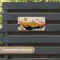 Les Posters de jardin, également appelées toiles de jardin, sont des affiches spécialement conçues pour être accrochées à l'extérieur. Cette nappe de jardin peut donc prendre une raclée. La voile Bisonyl a été utilisée pour cette affiche extérieure. Cette voile est une bâche enduite avec une belle finition. L'affiche de jardin est résistante aux UV, elle ne se décolore donc pas au soleil. Plusieurs anneaux ont été placés dans la toile pour que vous puissiez facilement l'accrocher! Jusqu'à une taille de 120x80 cm, les anneaux sont dans les coins, avec des tailles plus grandes, les anneaux viennent tous les 60 cm. Le tissu peut résister aux différentes conditions météorologiques et durera au moins 3 ans.