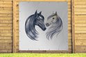 Ces deux chevaux sont peints à l'aquarelle. Un cheval est blanc et l'autre cheval est noir.