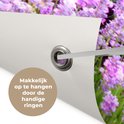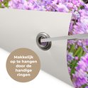 Les Posters de jardin, également appelées toiles de jardin, sont des affiches spécialement conçues pour être accrochées à l'extérieur. Cette nappe de jardin peut donc prendre une raclée. La voile Bisonyl a été utilisée pour cette affiche extérieure. Cette voile est une bâche enduite avec une belle finition. L'affiche de jardin est résistante aux UV, elle ne se décolore donc pas au soleil. Plusieurs anneaux ont été placés dans la toile pour que vous puissiez facilement l'accrocher! Jusqu'à une taille de 120x80 cm, les anneaux sont dans les coins, avec des tailles plus grandes, les anneaux viennent tous les 60 cm. Le tissu peut résister aux différentes conditions météorologiques et durera au moins 3 ans.