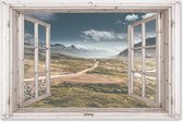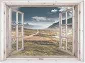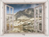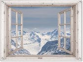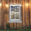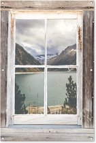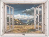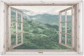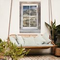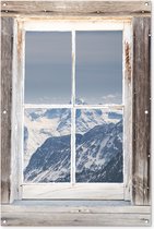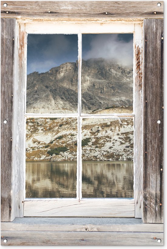 La fenêtre en bois donne sur les montagnes.À propos de GreatGardenPosters
