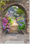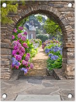 Une affiche de jardin montrant un chemin entouré d'hortensias roses et bleus. Le chemin est encadré par un portail en pierre.